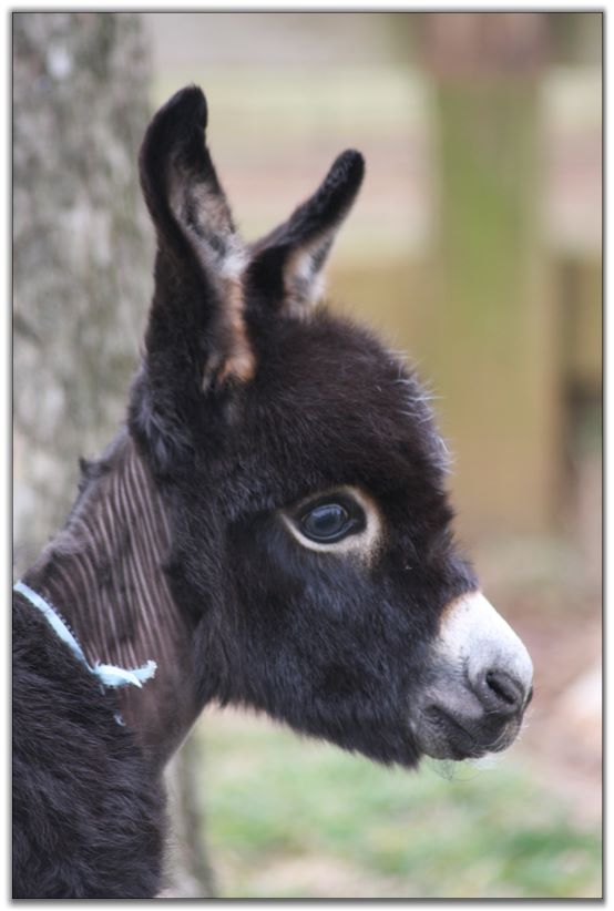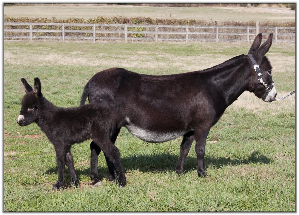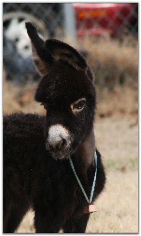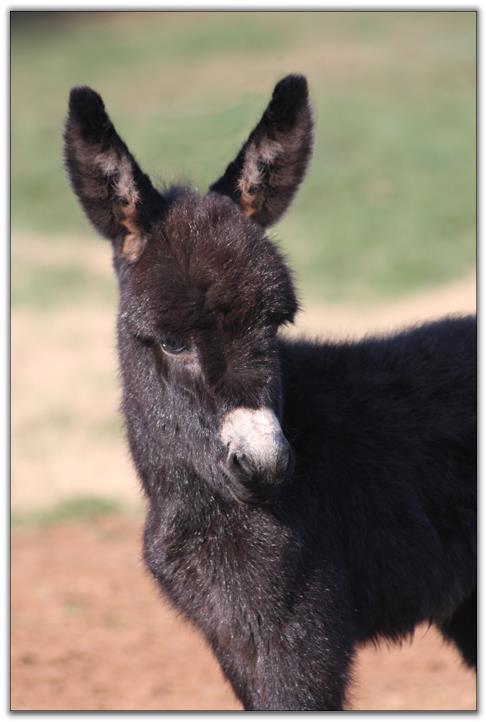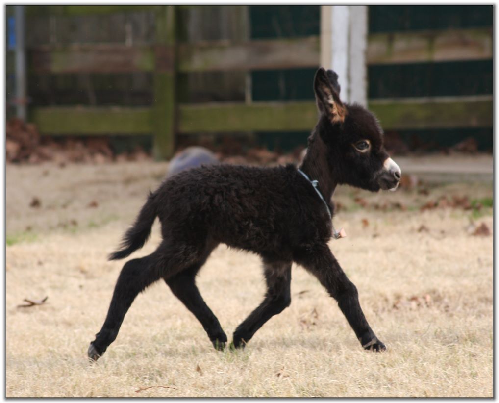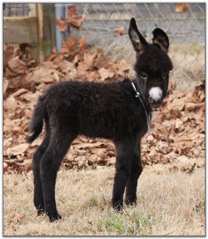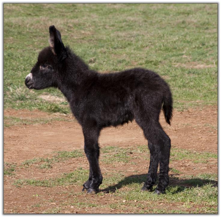 At 6:48 p.m. Christmas Day, Raven presented us with a precious little black jack. There is always an anxious feeling about a maiden with her first foal. At first all appeared to be okay. The actual birth process took a bit longer than most as Raven, being a maiden, and having a very small opening, was having some difficulty pushing her foal out. Joe was there to help her and thank goodness he was. He worked very hard and pulled every time she would push. At last the foal was out. Before too much time had passed we observed the foal was taking an unusually long time in getting on his feet, and staying on them once he got up. Raven appeared to be overly anxious to smother him with kisses and licks, although she, too, seemed a bit unsure of what to do. Both mother and baby kept trying to do what new moms and babies do but neither was sure of what their role was in the situation. It took Magi an hour before he stood up and then he still did not approach his mother. In her defense, she was rather pushy with him and kept biting at him and pushing him in the wrong direction. After a while, not nearly as long as it seemed, Dayle and Joe intervened and tried to assist in his nursing and getting the necessary nutrition to him. He refused to nurse the engorged teats so they milked Raven to give the milk to Magi. He drank it but after several feedings he was no longer swallowing. They immediately called the vet, wrapped Magi in a blanket and headed straight to the vet. Thank goodness he was born at Half Ass Acres where the cams were available, the vet was close, and he was under the care of such experienced breeders!